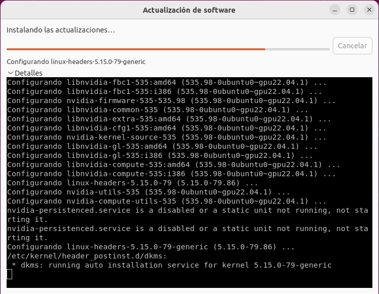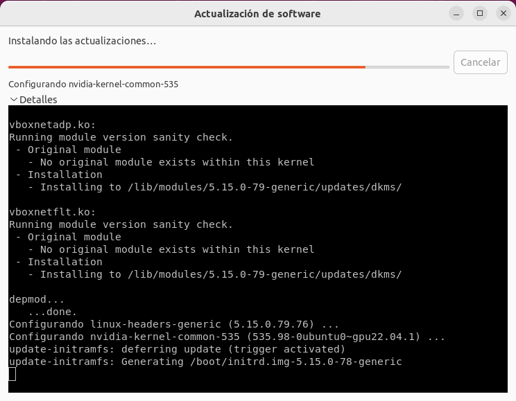 I find that the only thing that you can do with any certainty is just wait for the configuration process of installing the new Nvidia driver into the kernel has completed by watching your hard drive activity light. Depending on your cpu and storage speeds, the process completes after a few minutes at most. Then give the host the big reset button push and have the host reboot and you will find the new drivers installed with no problem. |