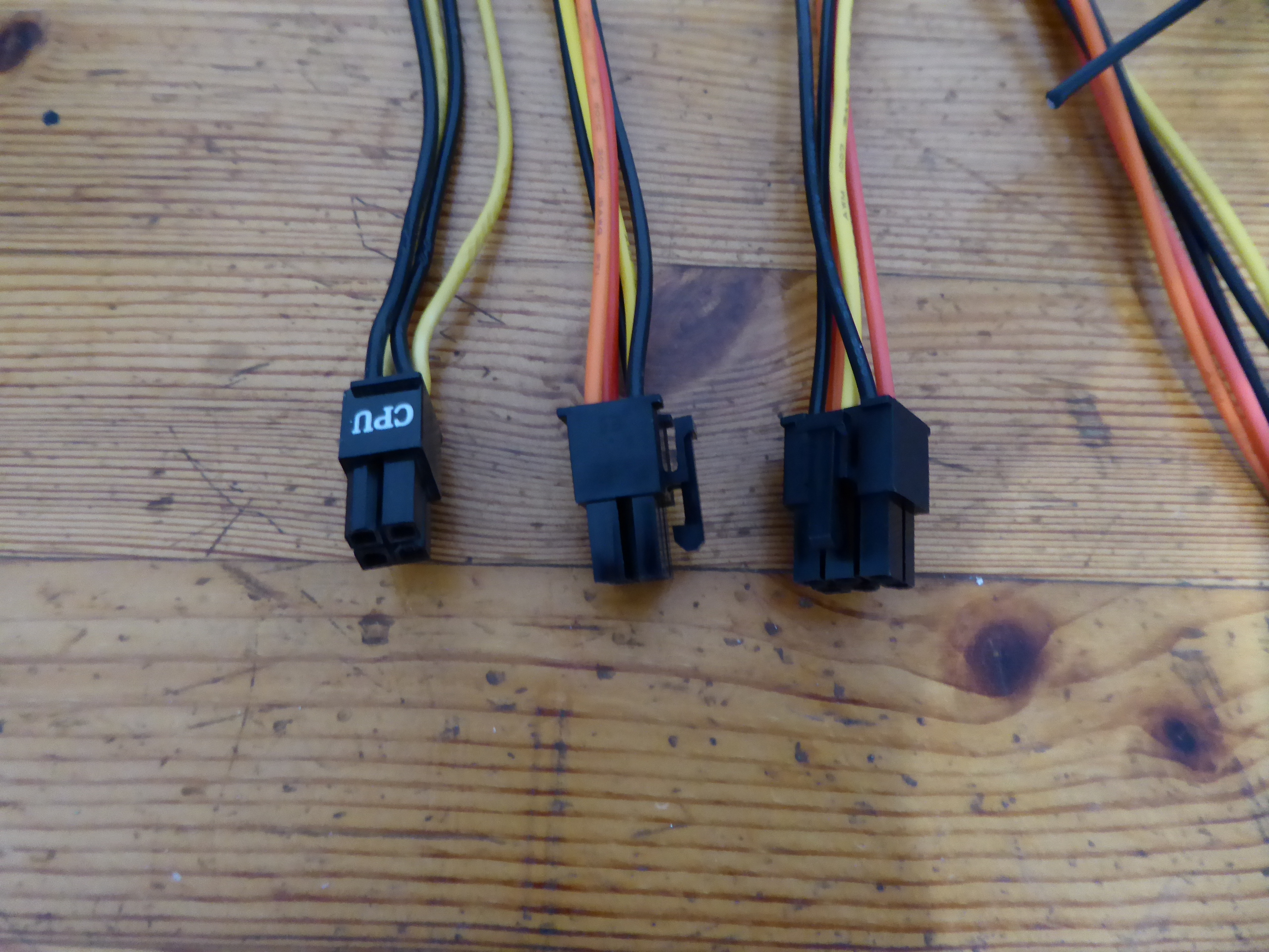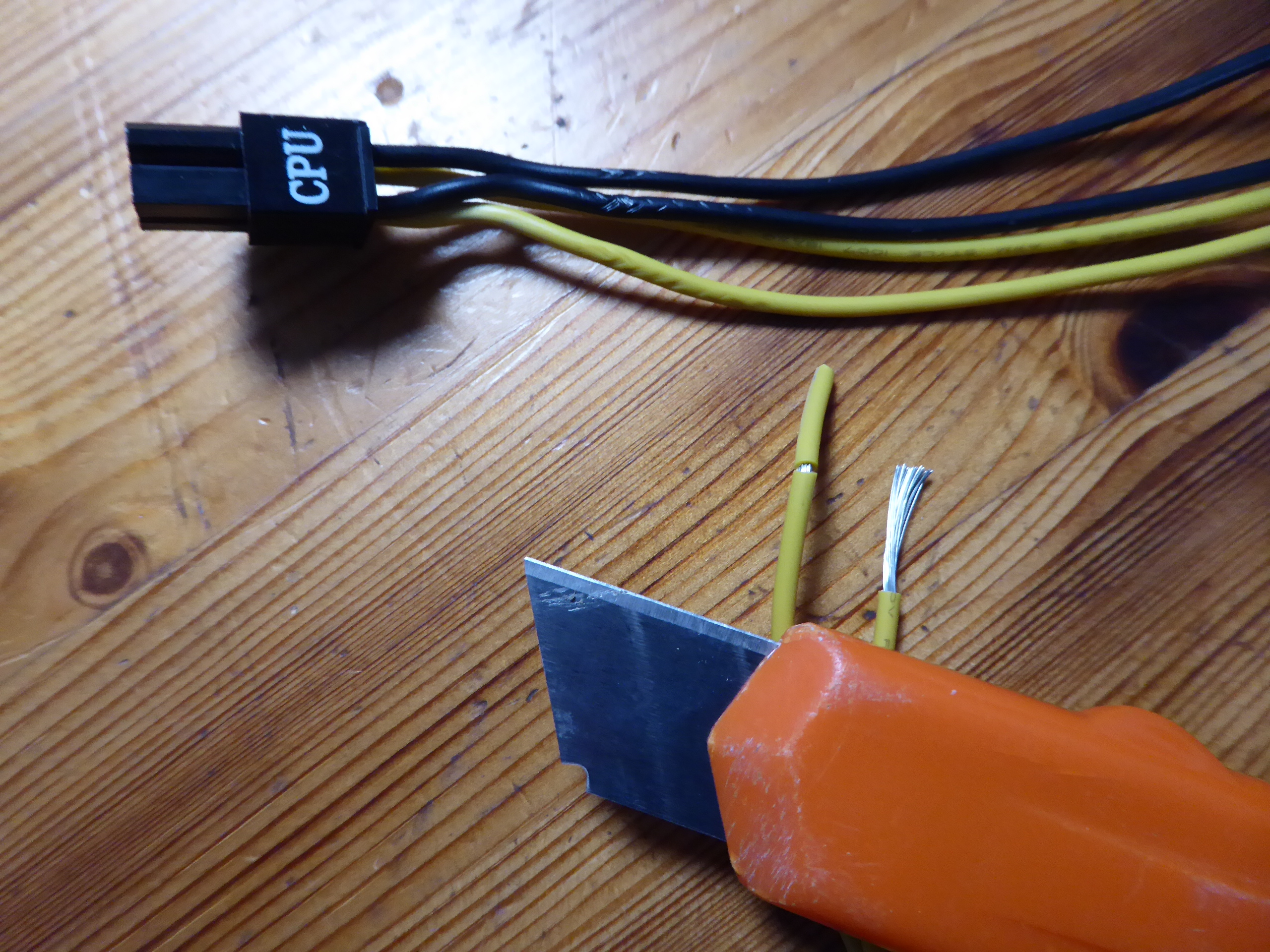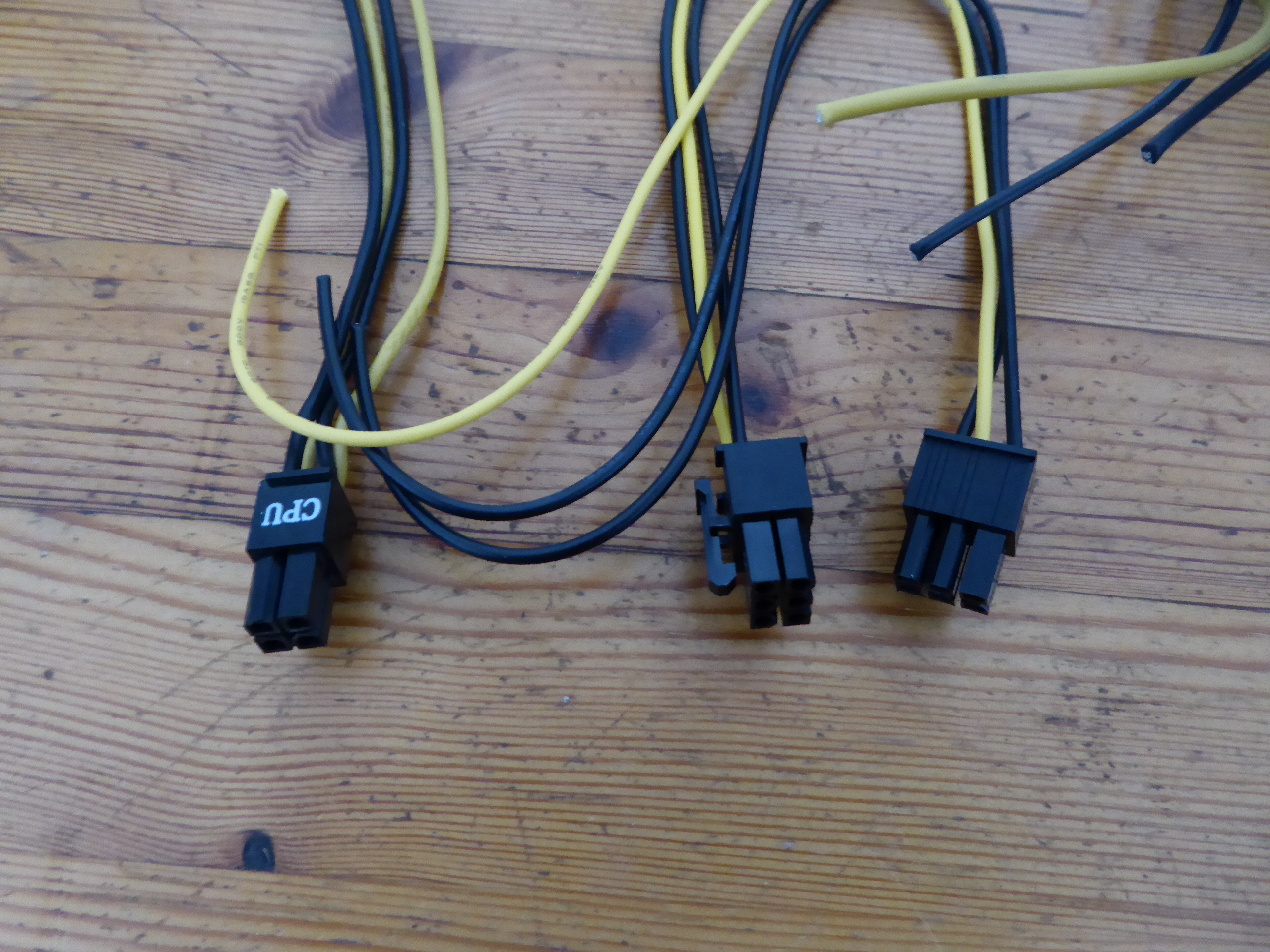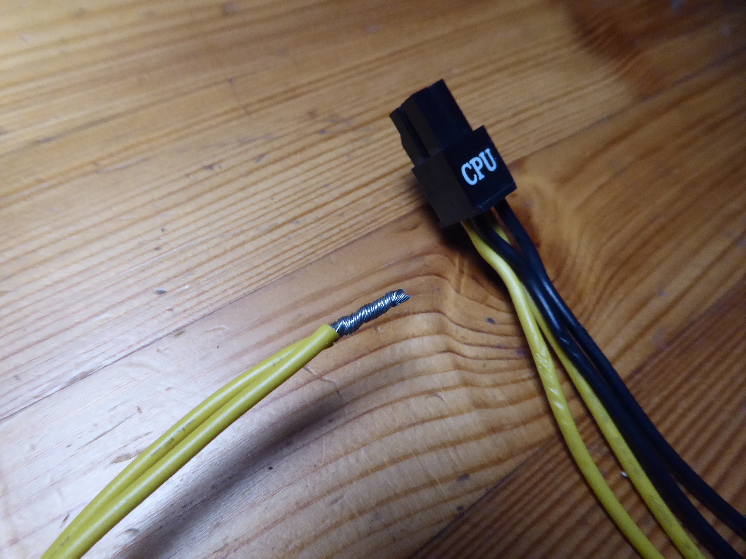But the extra 4-pin IS unnecessary if you’re already using an 8-pin. The 8-pin alone can supply over 200W. I agree that in my case currently it is not necessary, but what if it was? I'll try to make a solution with my available resources. Returning to this triple GPU system, it is supplied by a semi-modular Mars Gaming MPII 750 PSU. This PSU has a wired 20+4 pins ATX motherboard connector, and 4+4 pins connectors for supplying motherboard with +12V. It has also one modular +12V output for supplying 2xPCIE 6+2 pins power connections, and three more combined modular outputs, two of them ramaining available. And I'd kept (just in case) cutted out CPU 4+4 pins power wirings and two combined modular cables from a broken PSU... It is all what I need, apart from some (funny) workmanship. Tools and materials required: Cutting pliers, cutter, gas lighter, soldering iron, soldering tin, thermoshrinking sleeve, and several cable ties. I'll start by separating the necessary connectors, and then retiring unnecessary red (+5V) and orange (+3,3V) wires. Now only black (ground) and yellow (+12V) wires are remaining. (- Let's plug in soldering iron now, for it to be hot enough when needed -) Then, I'm stripping about 12 mm (~1/2 inch) of insulation at every wire ending, by cutting it around carefully and peeling it. Now I'm unfolding the stripped wire ends in what I call "the shape of a peacock's tail". Then, this spreaded wire ends are overlapped and twisted together to obtain this result. (It's said that world can be divided into two groups: The one of people twisting clockwise, and the other that prefer twisting counterclockwise... It doesn't matter, the result is the same ;-) Insert now about 32 mm (~1 1/4 inch) of shrinking sleeve at each grouped wires, and push it far apart from wire ends. Let me present at this moment a tool that I initially forgot: This practical "third hand" to hold wires while soldering them. Once soldering iron is hot enough (important), heat well the stripped wire end while applying generously some soldering tin along it, as can be seen (?) at this first take video. And at this other video we can see how yellow color wires are attached together by melting their preapplied soldering tin. Finally, we're protecting bare junction with preinserted (?!?) shrinking sleeve. I usually employ the colder blue portion of a gas flame, spreading heat quikly along all the sleeve until it completely shrinks. On the same way, I'll join all black wires together, and protecting them with isolating sleeve. Once soldering tasks are finished, don't forget unpluging soldering iron, and picking up every leftovers. We will finish grouping wires by means of evenly arranged cable ties. That's all. Here we have the final result. Does it work? Here is a before and after 01, after 02, and after 03 images of Host #480458 |