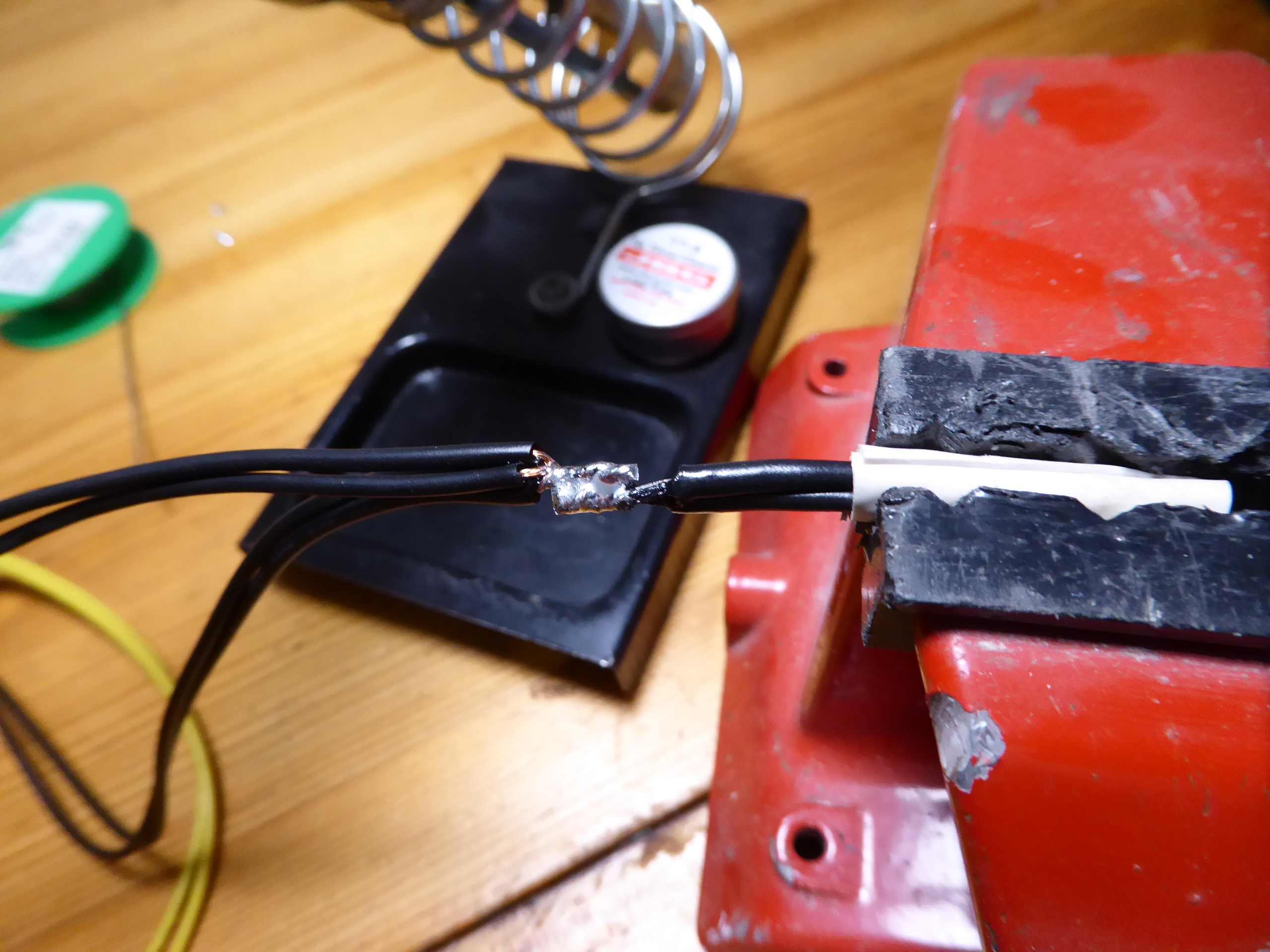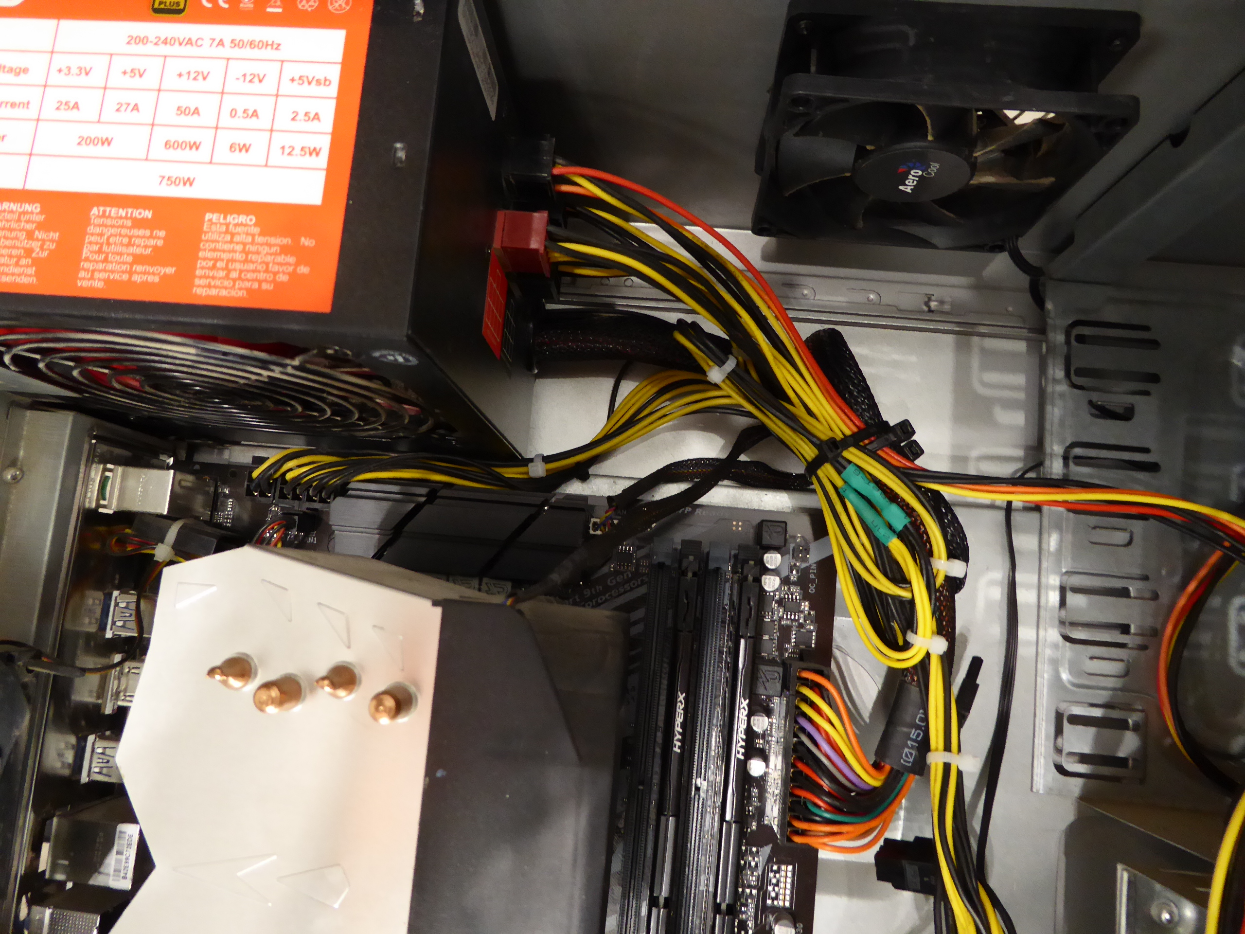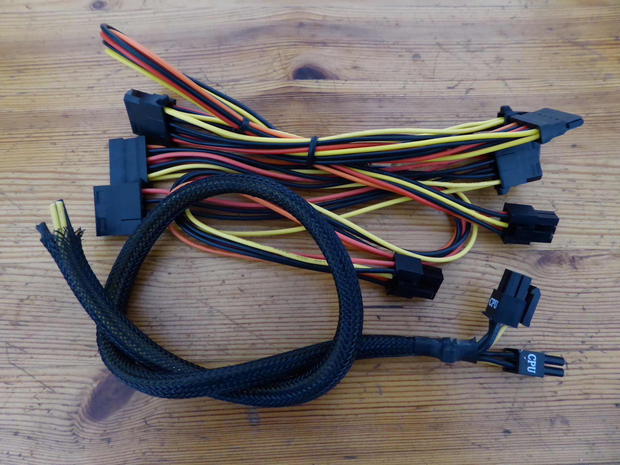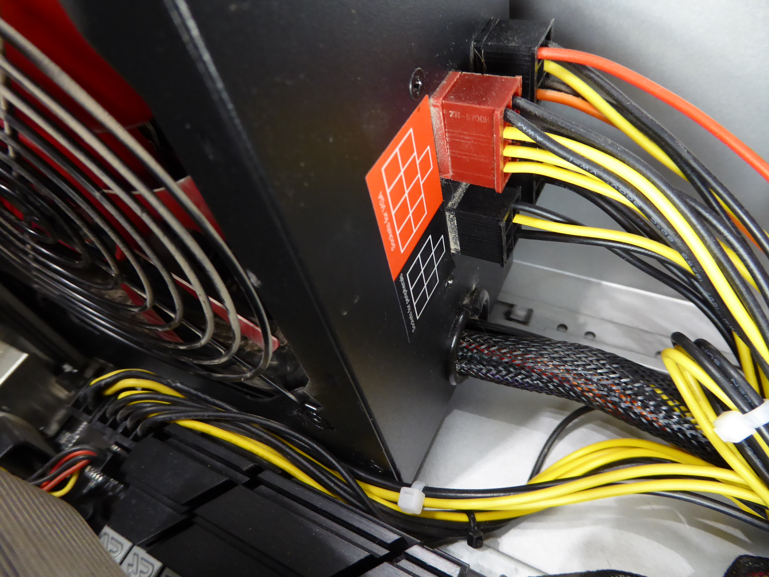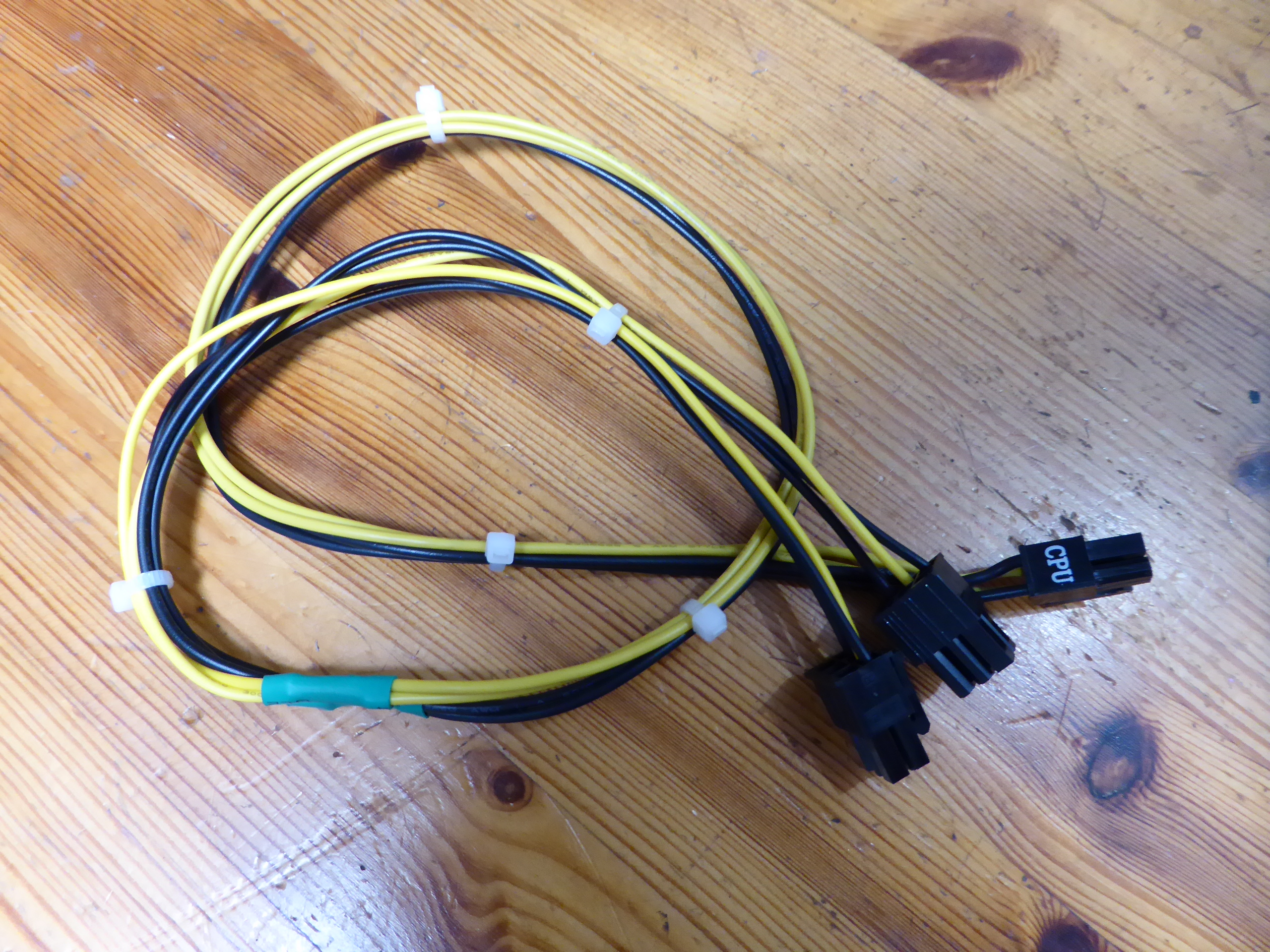 But the extra 4-pin IS unnecessary if you’re already using an 8-pin. The 8-pin alone can supply over 200W. I agree that in my case currently it is not necessary, but what if it was? I'll try to make a solution with my available resources. Returning to this triple GPU system, it is supplied by a semi-modular Mars Gaming MPII 750 PSU. This PSU has a wired 20+4 pins ATX motherboard connector, and 4+4 pins connectors for supplying motherboard with +12V. It has also one modular +12V output for supplying 2xPCIE 6+2 pins power connections, and three more combined modular outputs, two of them ramaining available. And I'd kept (just in case) cutted out CPU 4+4 pins power wirings and two combined modular cables from a broken PSU... It is all what I need, apart from some (funny) workmanship. Tools and materials required: Cutting pliers, cutter, gas lighter, soldering iron, soldering tin, thermoshrinking sleeve, and several cable ties. I'll start by separating the necessary connectors, and then retiring unnecessary red (+5V) and orange (+3,3V) wires. Now only black (ground) and yellow (+12V) wires are remaining. (- Let's plug in soldering iron now, for it to be hot enough when needed -) Then, I'm stripping about 12 mm (~1/2 inch) of insulation at every wire ending, by cutting it around carefully and peeling it. Now I'm unfolding the stripped wire ends in what I call "the shape of a peacock's tail". Then, this spreaded wire ends are overlapped and twisted together to obtain this result. (It's said that world can be divided into two groups: The one of people twisting clockwise, and the other that prefer twisting counterclockwise... It doesn't matter, the result is the same ;-) Insert now about 32 mm (~1 1/4 inch) of shrinking sleeve at each grouped wires, and push it far apart from wire ends. Let me present at this moment a tool that I initially forgot: This practical "third hand" to hold wires while soldering them. Once soldering iron is hot enough (important), heat well the stripped wire end while applying generously some soldering tin along it, as can be seen (?) at this first take video. And at this other video we can see how yellow color wires are attached together by melting their preapplied soldering tin. Finally, we're protecting bare junction with preinserted (?!?) shrinking sleeve. I usually employ the colder blue portion of a gas flame, spreading heat quikly along all the sleeve until it completely shrinks. On the same way, I'll join all black wires together, and protecting them with isolating sleeve. Once soldering tasks are finished, don't forget unpluging soldering iron, and picking up every leftovers. We will finish grouping wires by means of evenly arranged cable ties. That's all. Here we have the final result. Does it work? Here is a before and after 01, after 02, and after 03 images of Host #480458 |