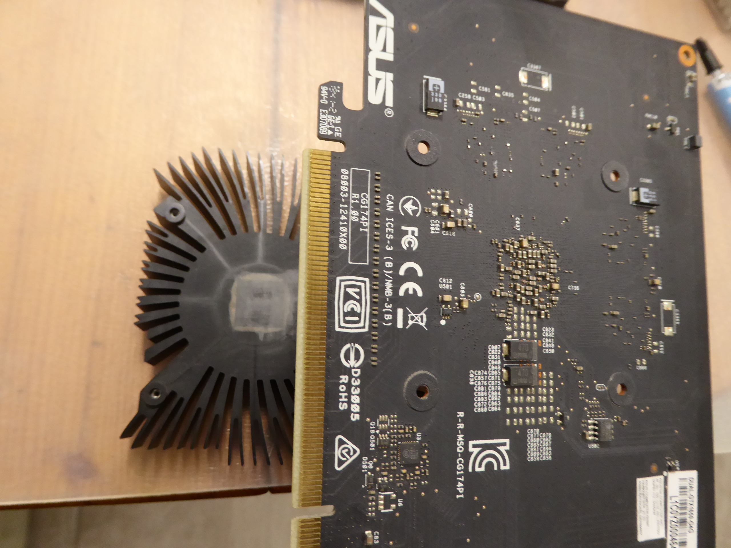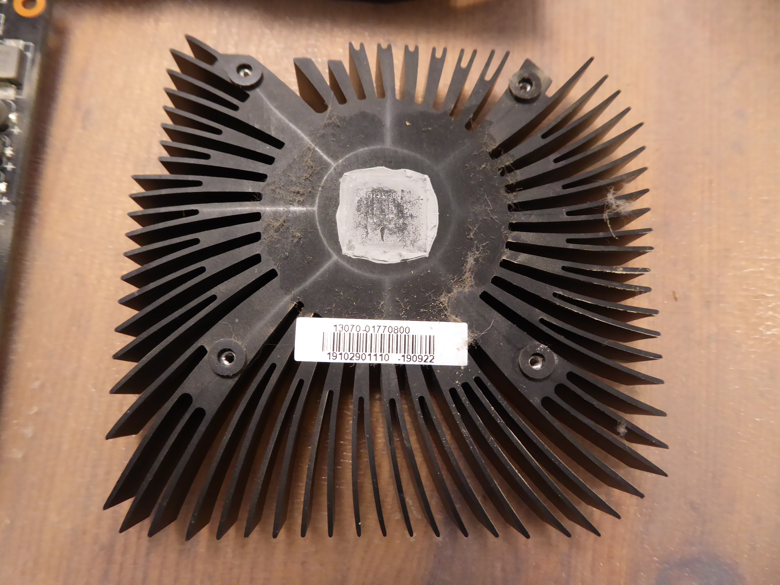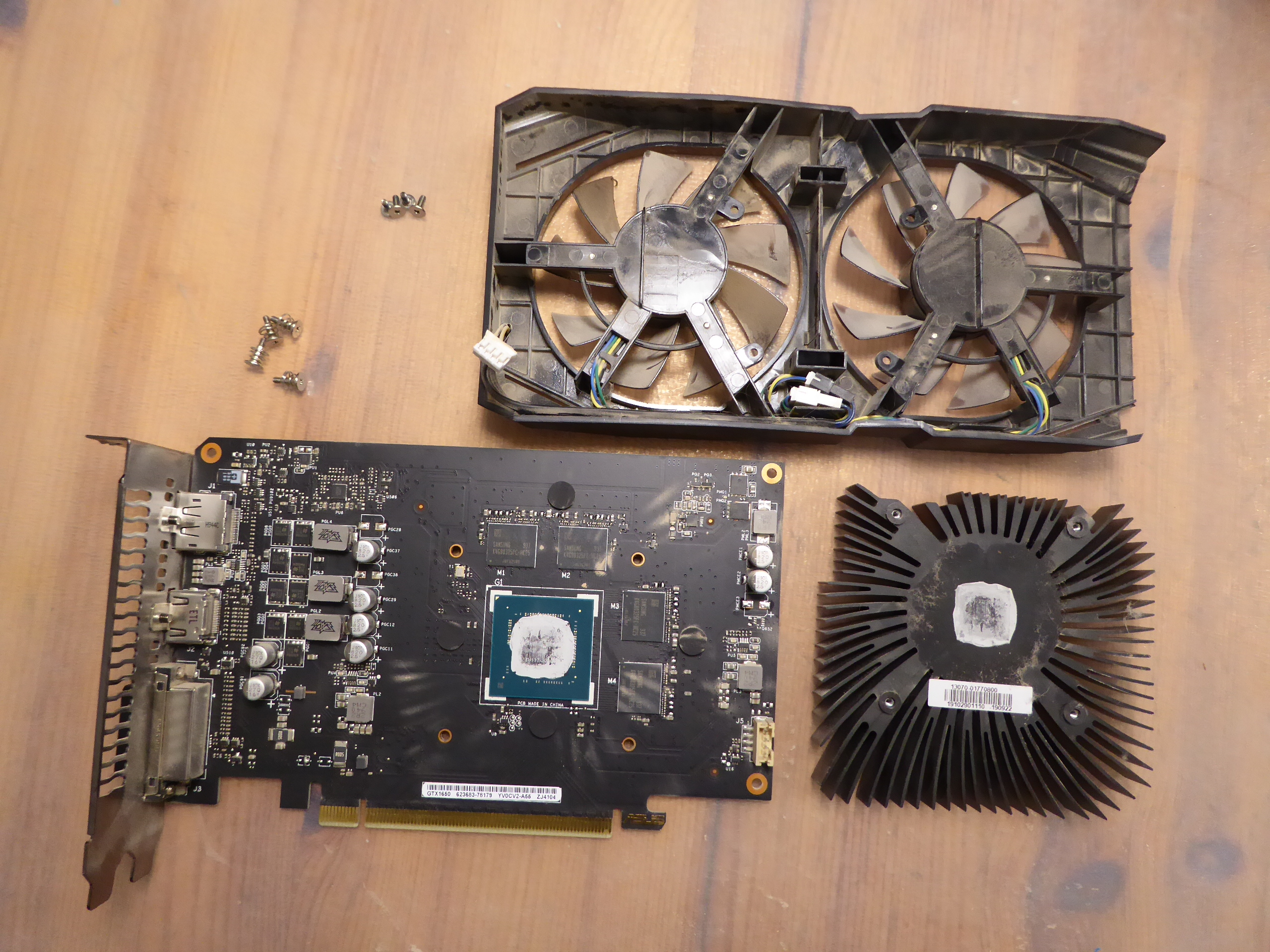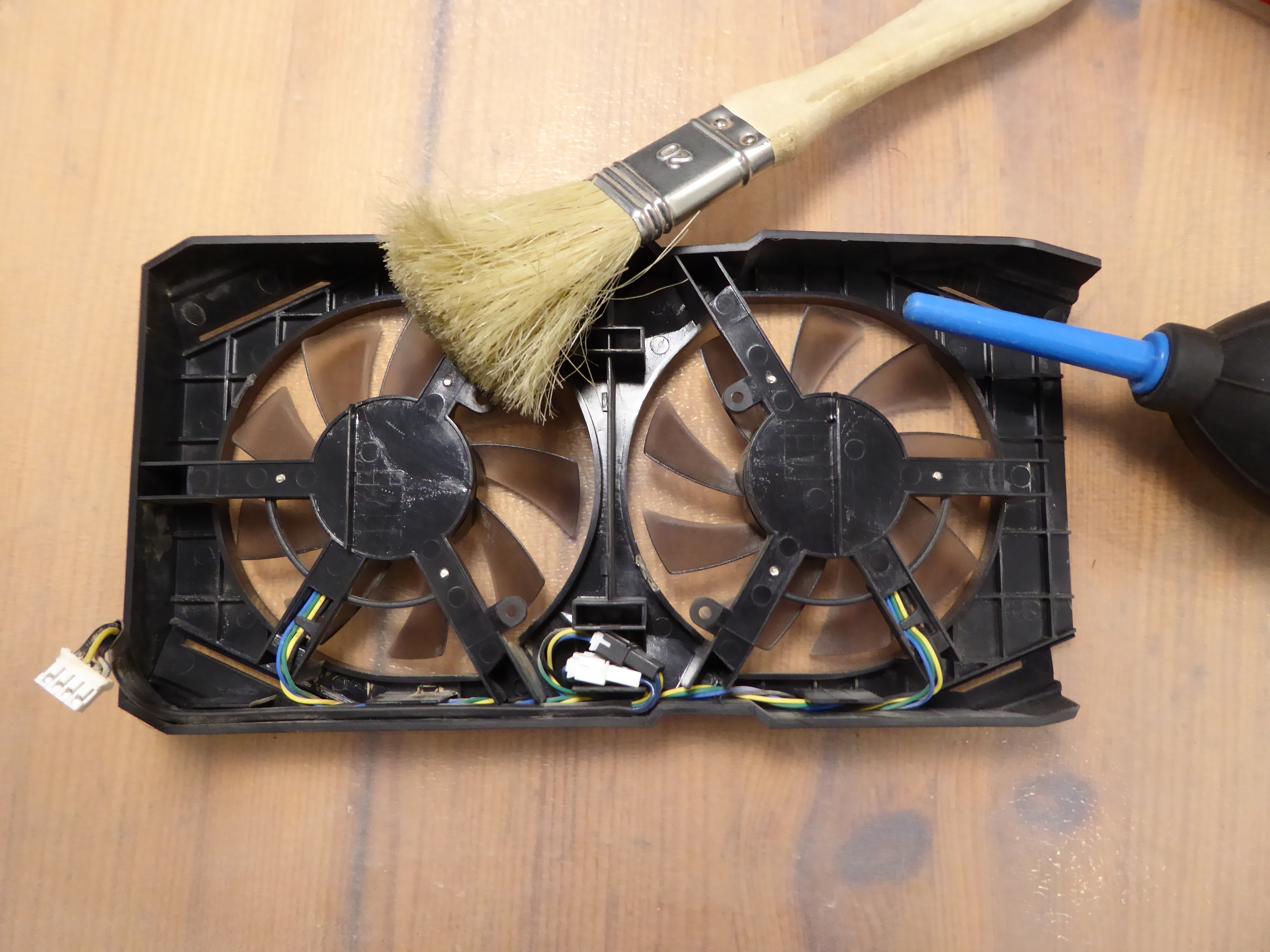 Graphics card cleaning During a temperature survey, I noticed high values for one of the graphics cards on a triple GPU system. Psensor monitoring application refers to this graphics card as "NVIDIA GeForce GTX 1650 2" It is physically the middle one card on this 3x GTX 1650 blended GPU system, having the worst air circulation of them. Temperature for this card was hitting 81 ºC, and then stabilizing at 80 ºC. This is enough reason for me to discard some problem on its refrigeration system. Both fans are turning, no problem on them. A full maintenance consists of dismounting heatsink and fans, cleaning them and circuitry thoroughly, and replacing the thermal paste. Here is the affected graphics card on the table. This other image shows the heatsink and fans frame dismounted apart. I'm starting by cleaning the anodized aluminum heatsink with a rigid bristles brush. I usually remove any labels attached to fins, to improve air circulation as much as possible. I also removed any aged thermal paste leftovers by means of cotton swabs and alcohol. Here is the heatsink appearance before and after cleaning. Now is time for the fans frame. I'll use a soft bristles brush and optics blower for cleaning the whole assembly. Here is the fans frame before and after cleaning. And lastly, I'm cleaning the circuitry from stacked dust, and removing thermal paste leftovers from GPU chip and silicon. Here is its final look. Now is time to remount everything again, starting by dispensing some self-spreading thermal paste over GPU chip's silicon surface. My favorite way to remount heatsink is by lying it upwards on the border of the table, and then aproaching the graphics card circuitry while watching a perfect match by looking coincidence through card's fixing holes. Then I slightly attach screws on two corners, then on the other two, and fix them completely by turning gradually to the end, following a cross pattern. Now the graphics card is ready to attach the fans frame again (please, don't forget to reattach fan's electrical connector first ;-) Finally, graphics card is again at its working position. Currently, this graphics card is running slightly overclocked (+55 MHZ), with a fixed 70% fan rate to enhance air circulation. Enough to get 48H bonus, that it was missing earlier. Differences in working temperatures can be appreciated by comparing the before and after graphics. |