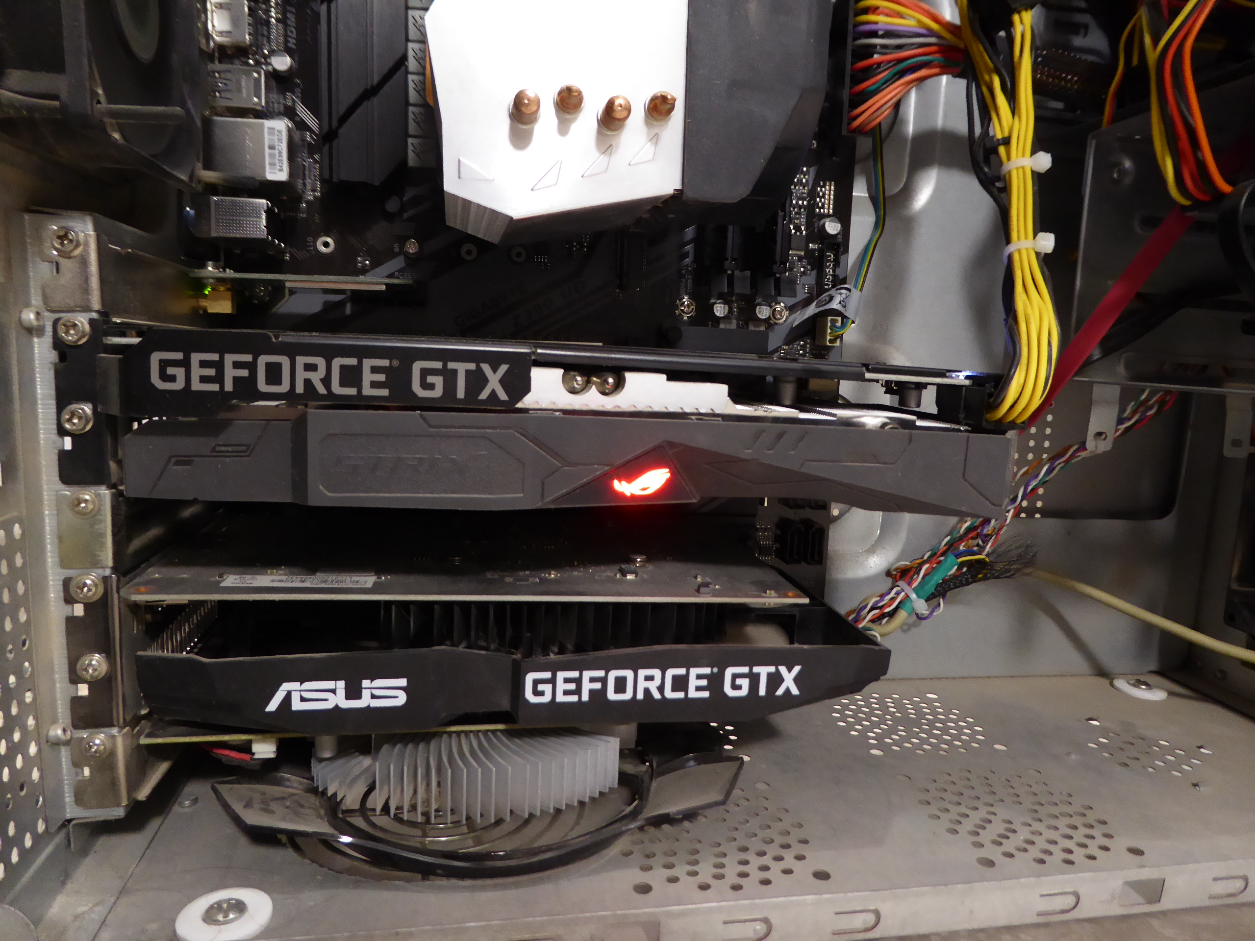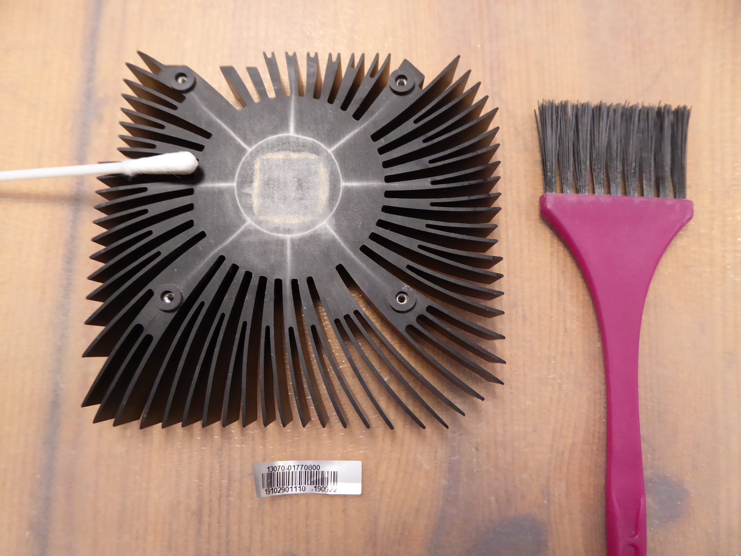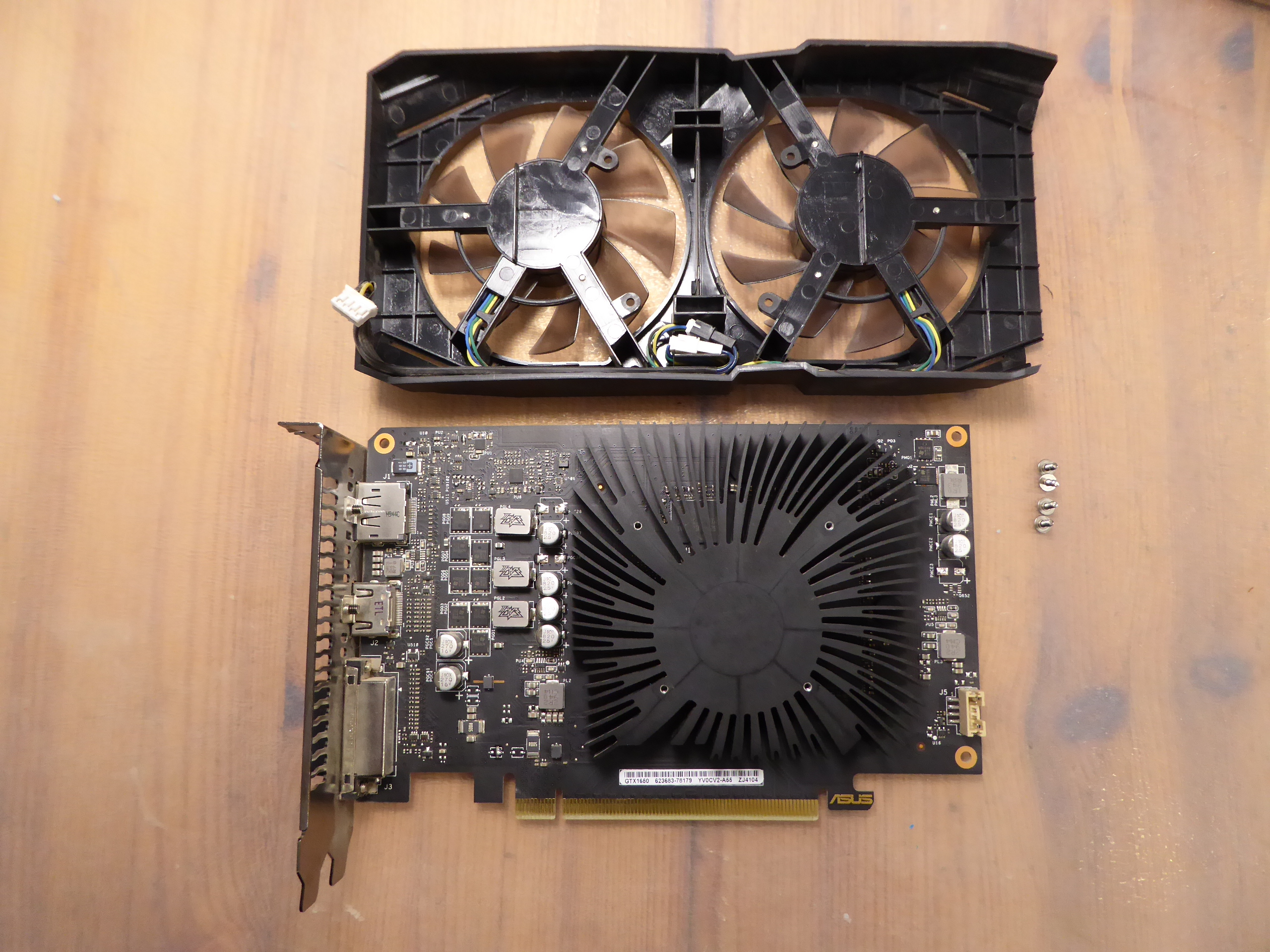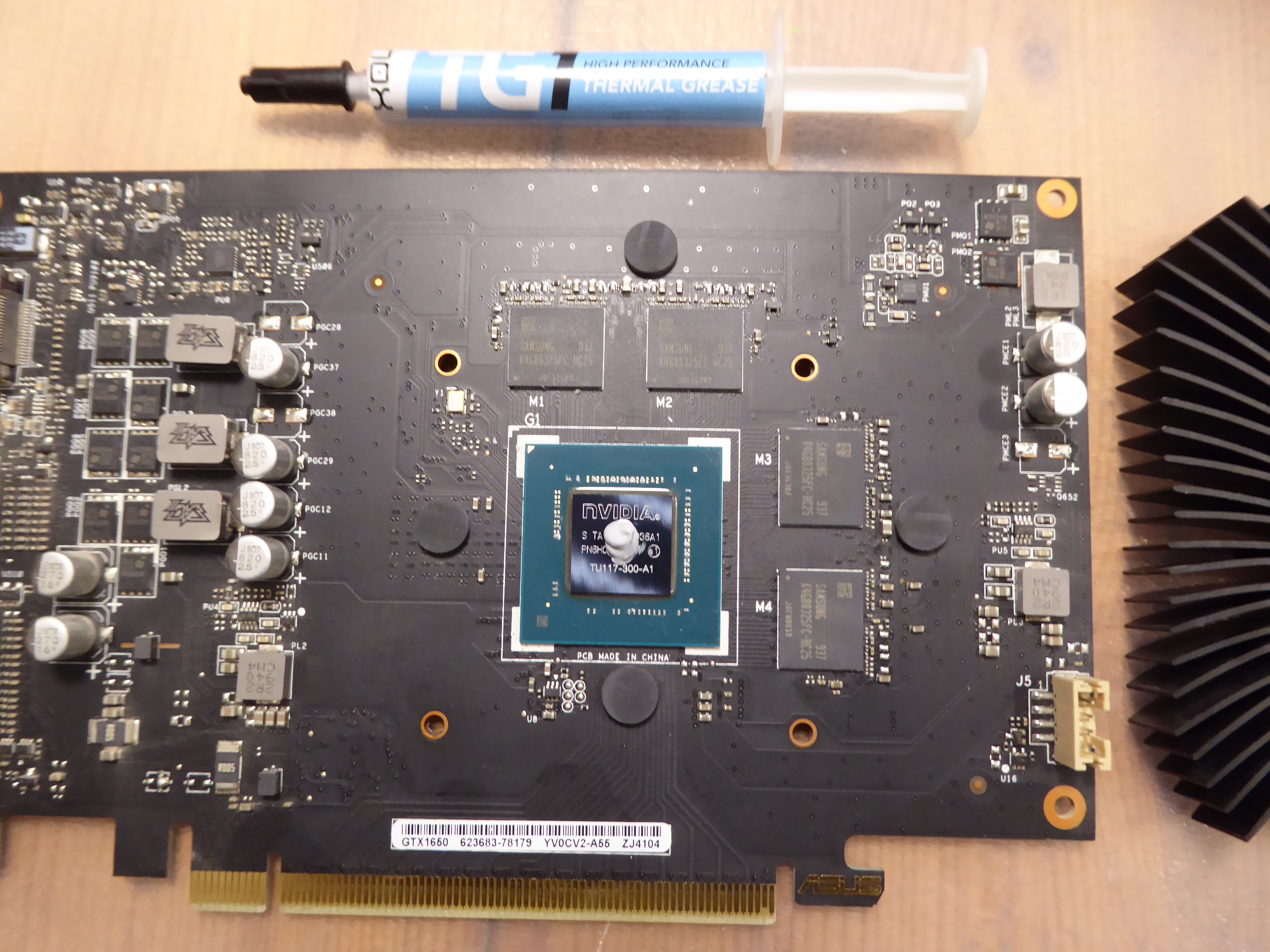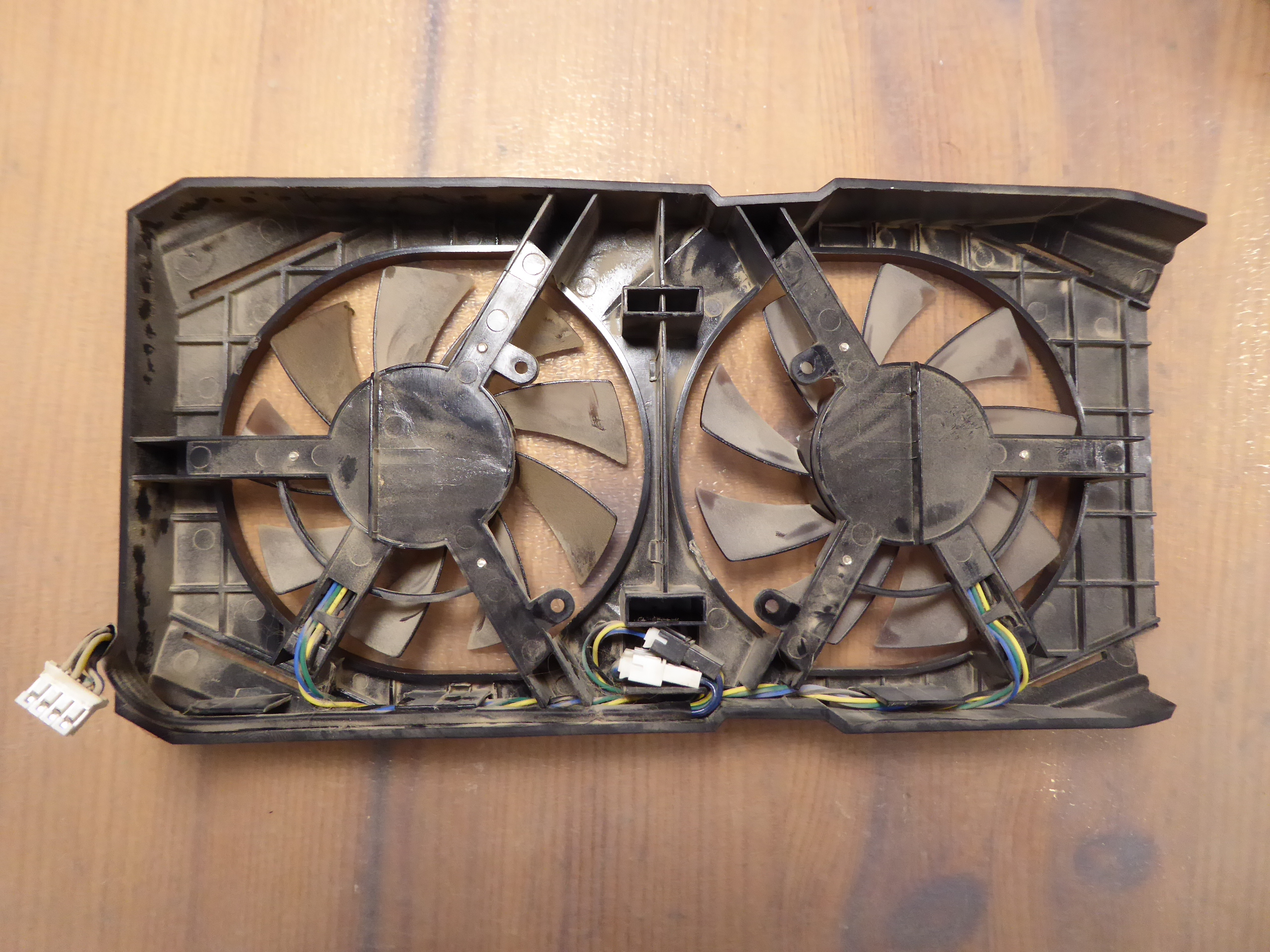Graphics card cleaning During a temperature survey, I noticed high values for one of the graphics cards on a triple GPU system. Psensor monitoring application refers to this graphics card as "NVIDIA GeForce GTX 1650 2" It is physically the middle one card on this 3x GTX 1650 blended GPU system, having the worst air circulation of them. Temperature for this card was hitting 81 ºC, and then stabilizing at 80 ºC. This is enough reason for me to discard some problem on its refrigeration system. Both fans are turning, no problem on them. A full maintenance consists of dismounting heatsink and fans, cleaning them and circuitry thoroughly, and replacing the thermal paste. Here is the affected graphics card on the table. This other image shows the heatsink and fans frame dismounted apart. I'm starting by cleaning the anodized aluminum heatsink with a rigid bristles brush. I usually remove any labels attached to fins, to improve air circulation as much as possible. I also removed any aged thermal paste leftovers by means of cotton swabs and alcohol. Here is the heatsink appearance before and after cleaning. Now is time for the fans frame. I'll use a soft bristles brush and optics blower for cleaning the whole assembly. Here is the fans frame before and after cleaning. And lastly, I'm cleaning the circuitry from stacked dust, and removing thermal paste leftovers from GPU chip and silicon. Here is its final look. Now is time to remount everything again, starting by dispensing some self-spreading thermal paste over GPU chip's silicon surface. My favorite way to remount heatsink is by lying it upwards on the border of the table, and then aproaching the graphics card circuitry while watching a perfect match by looking coincidence through card's fixing holes. Then I slightly attach screws on two corners, then on the other two, and fix them completely by turning gradually to the end, following a cross pattern. Now the graphics card is ready to attach the fans frame again (please, don't forget to reattach fan's electrical connector first ;-) Finally, graphics card is again at its working position. Currently, this graphics card is running slightly overclocked (+55 MHZ), with a fixed 70% fan rate to enhance air circulation. Enough to get 48H bonus, that it was missing earlier. Differences in working temperatures can be appreciated by comparing the before and after graphics. |