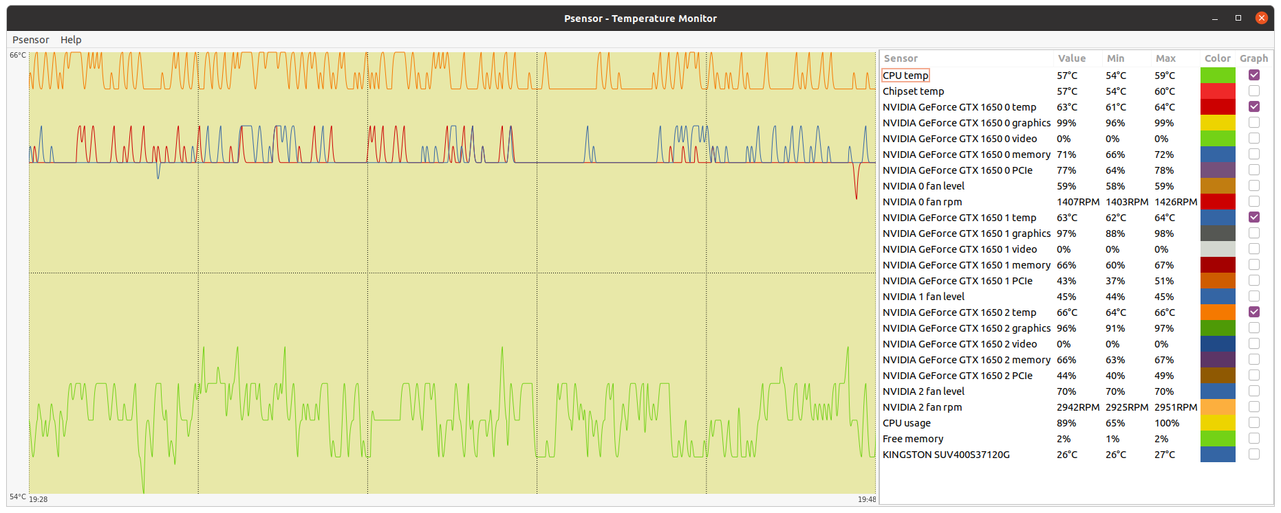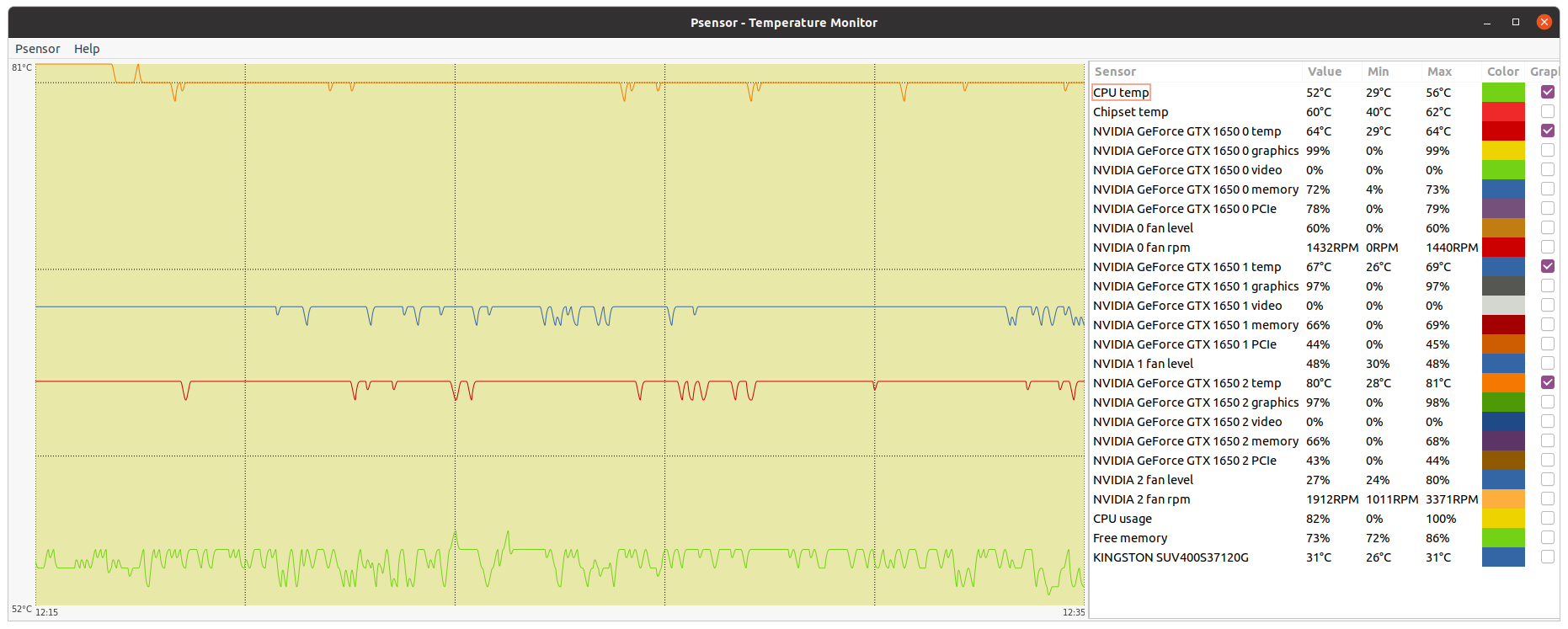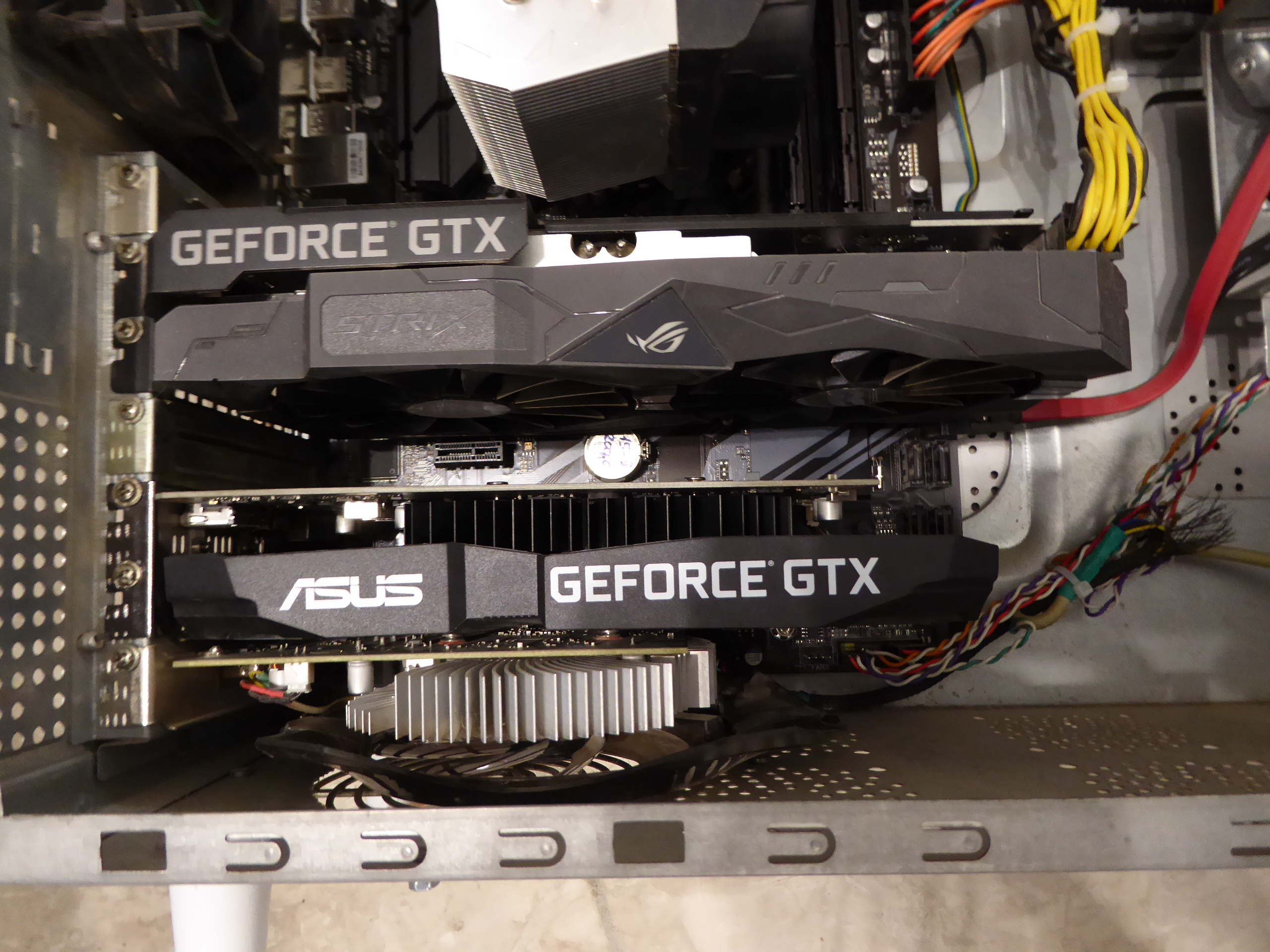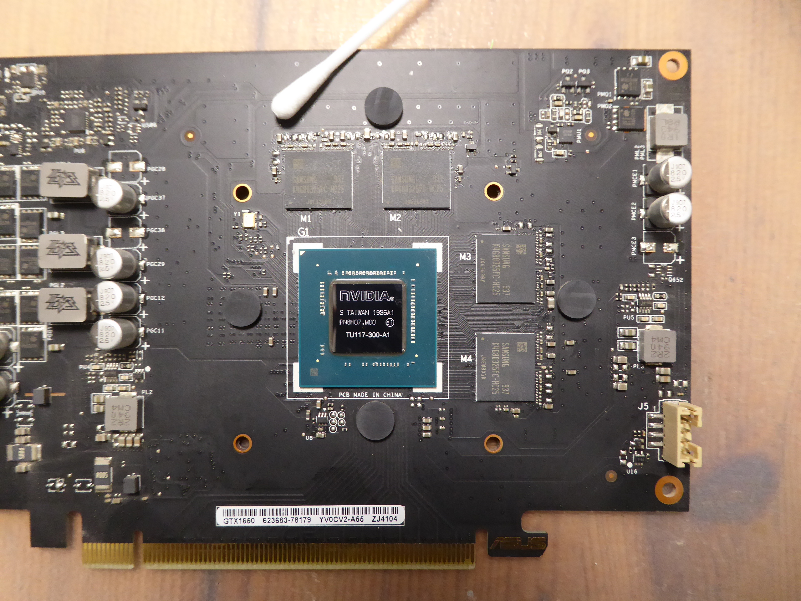 Graphics card cleaning During a temperature survey, I noticed high values for one of the graphics cards on a triple GPU system. Psensor monitoring application refers to this graphics card as "NVIDIA GeForce GTX 1650 2" It is physically the middle one card on this 3x GTX 1650 blended GPU system, having the worst air circulation of them. Temperature for this card was hitting 81 ºC, and then stabilizing at 80 ºC. This is enough reason for me to discard some problem on its refrigeration system. Both fans are turning, no problem on them. A full maintenance consists of dismounting heatsink and fans, cleaning them and circuitry thoroughly, and replacing the thermal paste. Here is the affected graphics card on the table. This other image shows the heatsink and fans frame dismounted apart. I'm starting by cleaning the anodized aluminum heatsink with a rigid bristles brush. I usually remove any labels attached to fins, to improve air circulation as much as possible. I also removed any aged thermal paste leftovers by means of cotton swabs and alcohol. Here is the heatsink appearance before and after cleaning. Now is time for the fans frame. I'll use a soft bristles brush and optics blower for cleaning the whole assembly. Here is the fans frame before and after cleaning. And lastly, I'm cleaning the circuitry from stacked dust, and removing thermal paste leftovers from GPU chip and silicon. Here is its final look. Now is time to remount everything again, starting by dispensing some self-spreading thermal paste over GPU chip's silicon surface. My favorite way to remount heatsink is by lying it upwards on the border of the table, and then aproaching the graphics card circuitry while watching a perfect match by looking coincidence through card's fixing holes. Then I slightly attach screws on two corners, then on the other two, and fix them completely by turning gradually to the end, following a cross pattern. Now the graphics card is ready to attach the fans frame again (please, don't forget to reattach fan's electrical connector first ;-) Finally, graphics card is again at its working position. Currently, this graphics card is running slightly overclocked (+55 MHZ), with a fixed 70% fan rate to enhance air circulation. Enough to get 48H bonus, that it was missing earlier. Differences in working temperatures can be appreciated by comparing the before and after graphics. |
