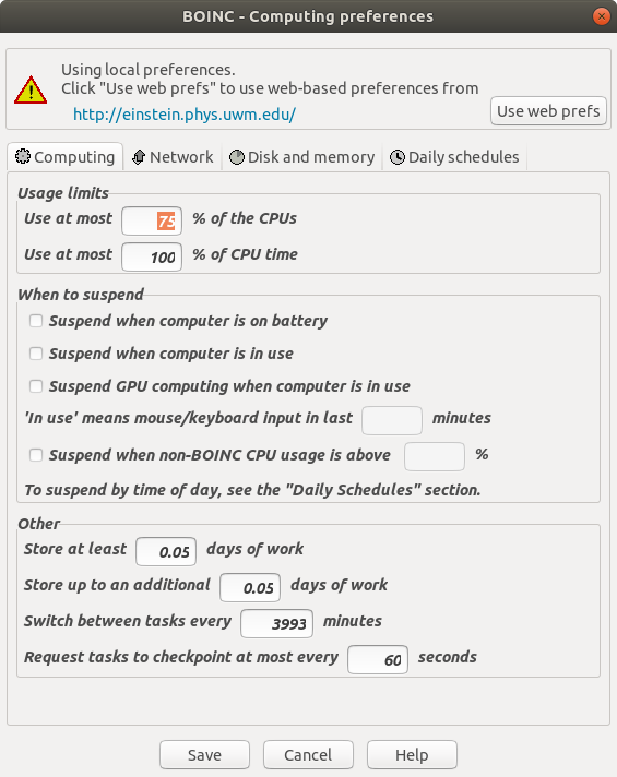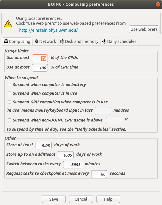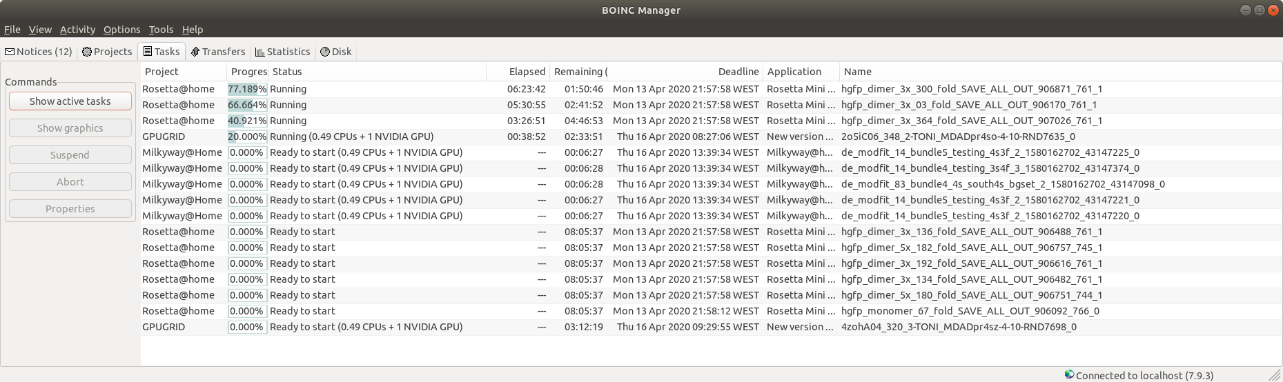 You still haven't explained why I have NO WUs as I stated before and GPUGRID says it can't get any more work because it can't finish on time. Sometimes things are the way they are, not the way they should be... I'll show you the way I like, with a practical example: Usually my BOINC Manager's Computing preferences are set like this, for not to get too much tasks at queue. In this situation, my list of running/Ready to start tasks is like this. Then, if I change preferences to "Store at least 9.05 days of work", I get a message like the following: Sat 11 Apr 2020 09:28:04 WEST | GPUGRID | Sending scheduler request: To fetch work. The same you are complaining about. And if I set preferences to "Store at least 4.05 days of work", the message changes to the following: Sat 11 Apr 2020 09:29:55 WEST | GPUGRID | update requested by user After that, my list of running/Ready to start tasks is like this. I've got an extra GPUGrid's WU, and then no more, due to current policy of maximum two tasks per GPU. This is so for me, and for every other GPUGrid's crunchers... I hope this can help you to manage your preferences to your best criteria. Kind regards, |