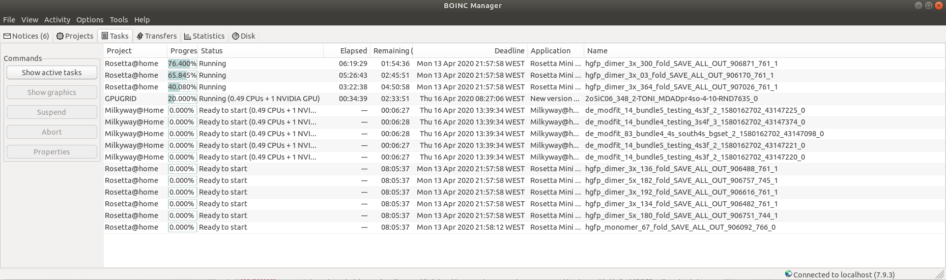 There is now reason to write in bold and big letters, we all try to help to solve problems! Apparently I do since no one reads or thinks before they respond. I said I have NO GPU work running and I get this response. How is this relevant? If you set buffer to 4,5 days or lower (for example), you'll probably receive an additional WU (two per GPU is the current maximum at GPUGrid)No, that doesn't fix the problem. I get no work from time to time and my GPU sets there not working on anything. Changing settings does NOT fix a thing. Been there done that with other sites that had this same issue. Question: How is you priority set for GPUGRID? Might it be, that it is lower than priorities on your CPU projects? In my experience BOINC gets confused sometimes when the priority for GPU work is lower than CPU work and does not download GPU WUs. Since it's the only GPU work I'm requesting then it doesn't matter. If BOINC gets "confused" on running 1 GPU work site like GPUGRID then BOINC has a big bug in it. I can change it to 10,000 and that won't fix a thing. Again been there done that with other sites that had the same issue and they had to fix it on their side. This is nothing new on deadline issues. GPUGRID works best with a short workbuffer, I get the next WU about 30 minutes before the last ends. No, it doesn't. I've been doing this for years and this is a first. And yes! GPUGRID needs shortest turn-around times possible, so you are asked not to bunker WUs, therefore the number of GPUGRID is limited to 2 per GPU at any given time. What are you talking about? Are you saying my 1080 Ti can't do long turn arounds? Not to mention it's overclocked. That has nothing to do with the setting you give me to change. |